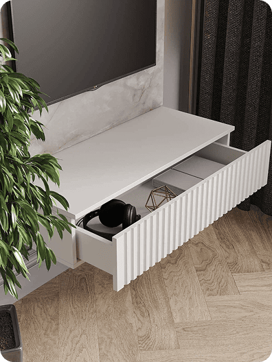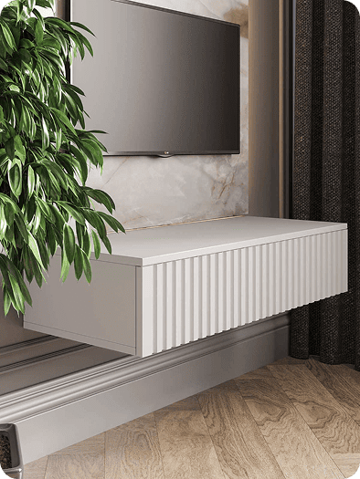 Тумба навесная под телевизор в белом цвете. Рифленый фасад.